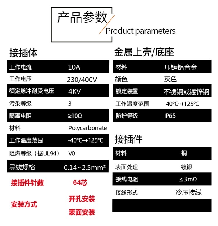 矩形重载连接器 64针/芯全套航空插头插座套件 HDC-HD-064
